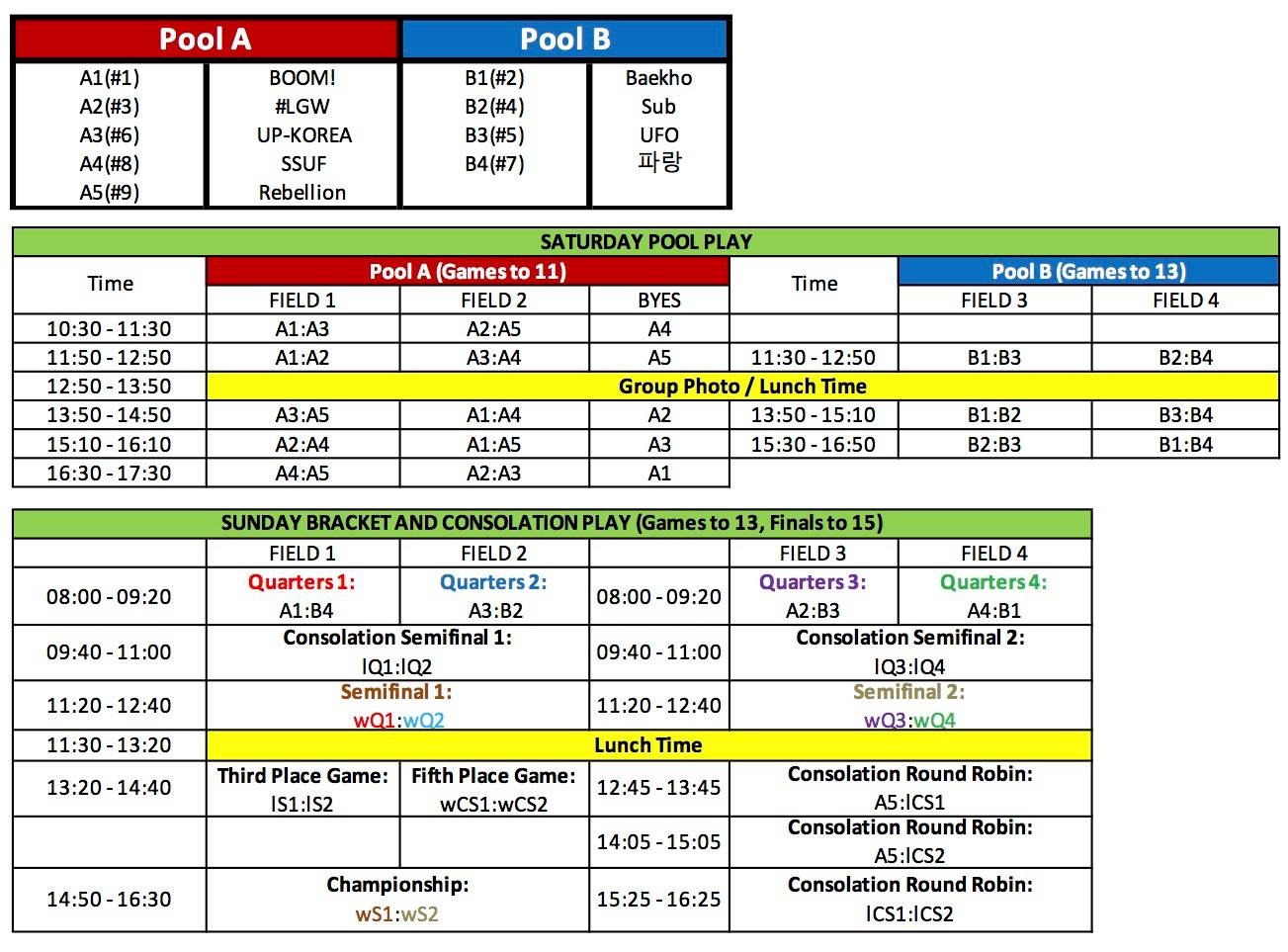 - A and B pools will have different game times and score caps, considering the difference in number of teams (A pool 60mins/11points, B pool 80mins/13points)
